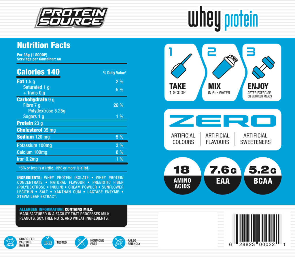 Protein Source Whey Protein is the perfect supplement to provide a complete source of protein for those who lead an active lifestyle. It contains 100% all-natural, high-quality ingredients and zero rBGH (Recombinant Bovine Growth Hormone), ensuring that what you put in your body is as pure as possible. For each serving, you’ll get 23 grams of protein and 7.6g of essential amino acids, plus 5g prebiotics, 7g of fiber, and an 18 amino acid superior amino acid profile.